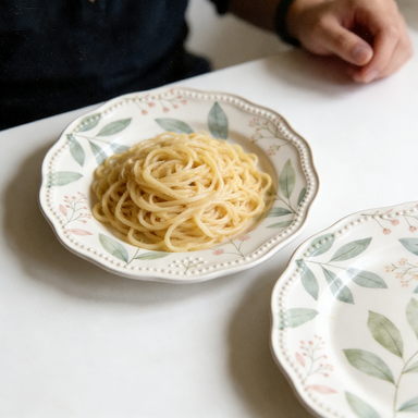 A charming white dinner plate adorned with a delicate sky-blue floral splatter pattern, featuring a smooth, durable finish perfect for everyday meals and casual gatherings. Its fresh, playful design adds a cheerful touch to any table setting.